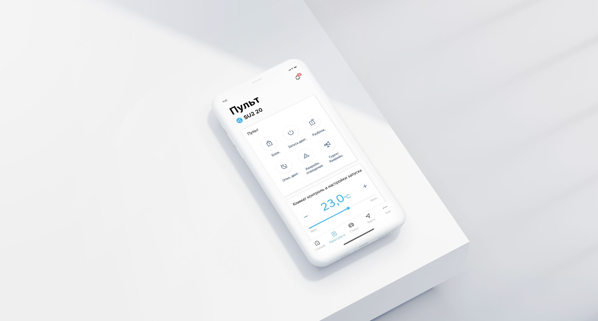 Возможность при дистанционном запуске двигателя задать требуемую температуру для прогрева или охлаждения салона, а также управление подогревом или вентиляцией сидений по отдельности, подогревом руля, боковых зеркал, лобового и заднего стекол в разное время года (в зависимости от комплектации, в приложении будет доступен соответствующий набор функций).